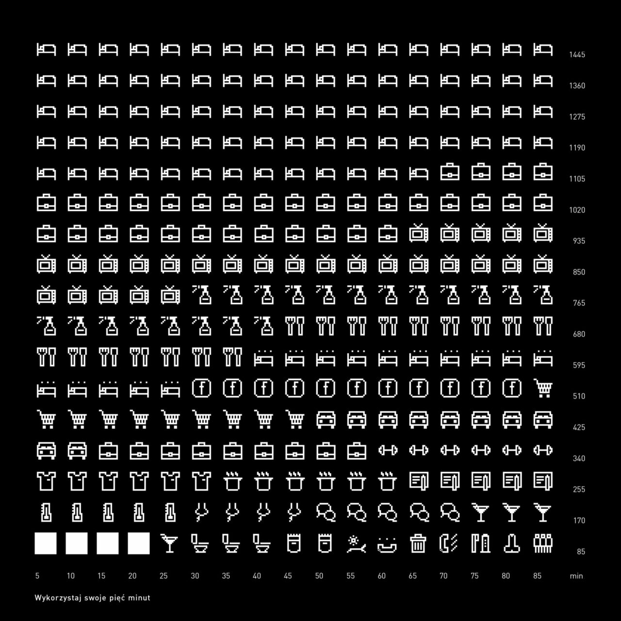 The first part of the book is a sequence of 28,489 pictograms representing all the days of our (averaged length) life. The pictograms symbolize the successive activities that make up our existence. Their number corresponds to the amount of time we devote to a given activity throughout our lives. The second part of the book expands on the theme of proportions – I compare the duration of activities that have a particularly strong impact on the imagination.