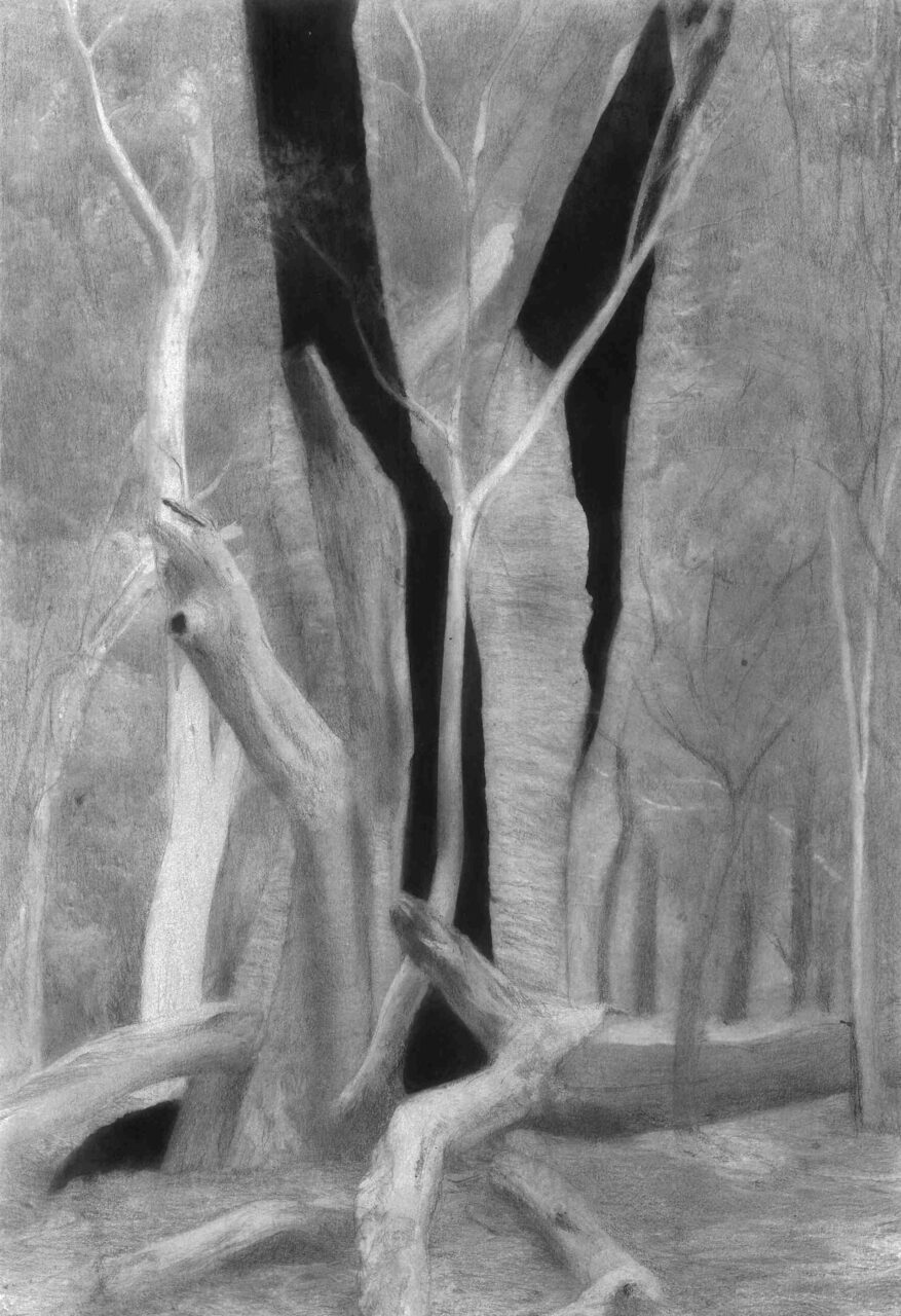 Odnoszę się do aktualnych tematów: pandemii, wojny, własnego doświadczenia śmierci w rodzinie. Umierające, spalone drzewa, które zaobserwowałam podczas spacerów krzyczą głośniej niż barwna roślinność wokół.